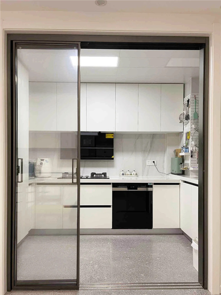 早期廚房裝修喜歡安裝地軌推拉門,但是會讓地面有衛生死角,很多污漬進入軌道槽內,就很難再清潔出來。目前比較流行的是做吊軌推拉門與隱形地軌推拉門,可大大減小清潔難度。
