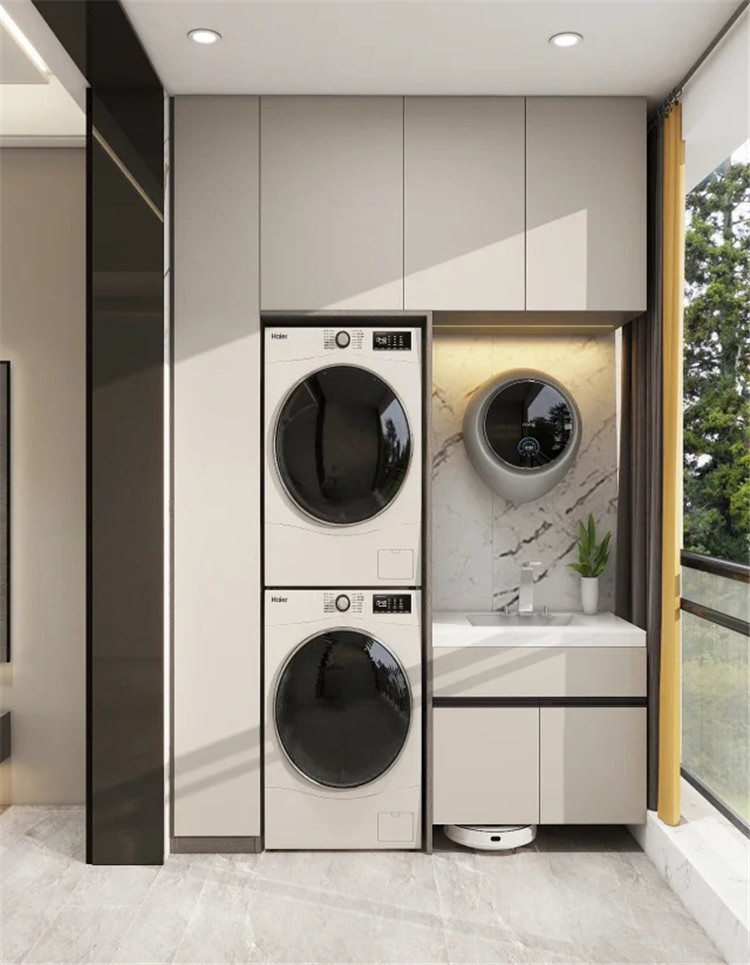 家務減負第一步,先要在家里規劃一個家政區。一般建議定制一組家政柜,集中存放各種清潔工具和清潔用品,用的時候拿取方便,柜門關上,整齊利落。