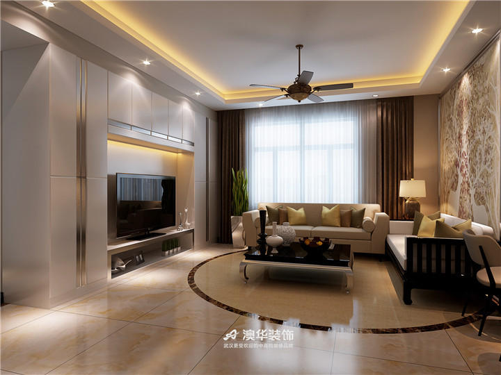 整體以白色為主,頂面和電視墻燈帶相互糅合后,呈現出獨特的視覺觀感,布藝沙發圍合式放置,滿足了家庭日常社交需求,地面增置圓形地毯,與方形吊頂對立碰撞,提升了空間的層次感,沙發左側空間設以收納柜面,簡單的線條勾勒出時尚沉穩的力量。