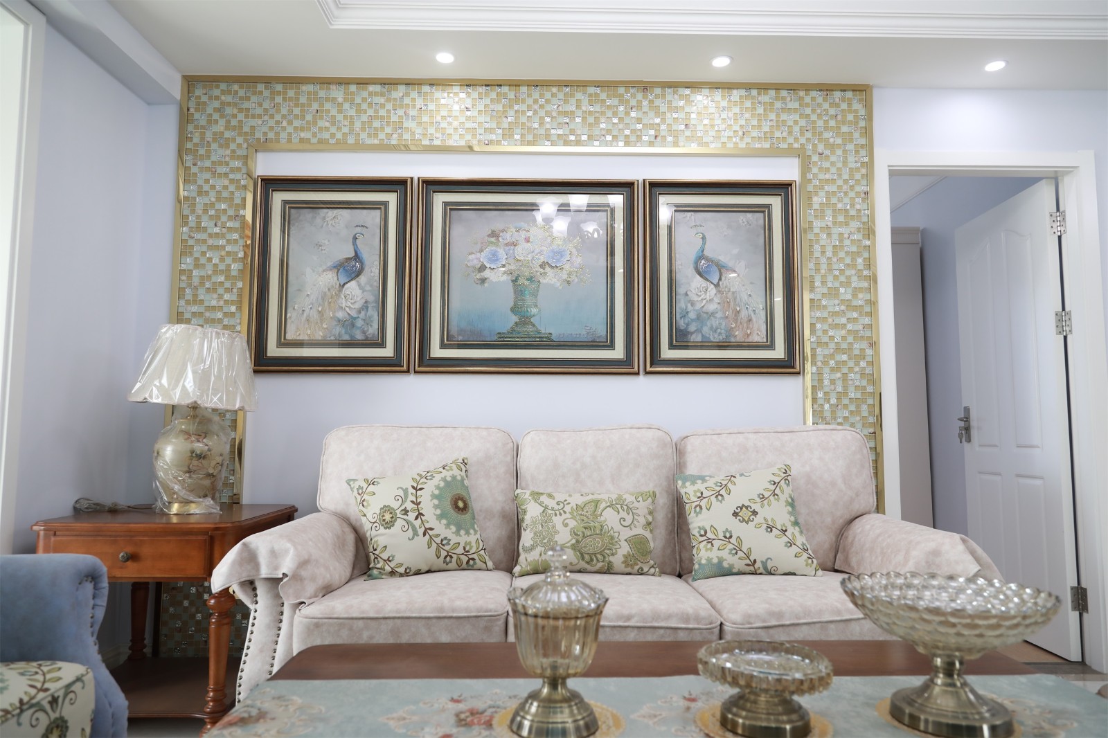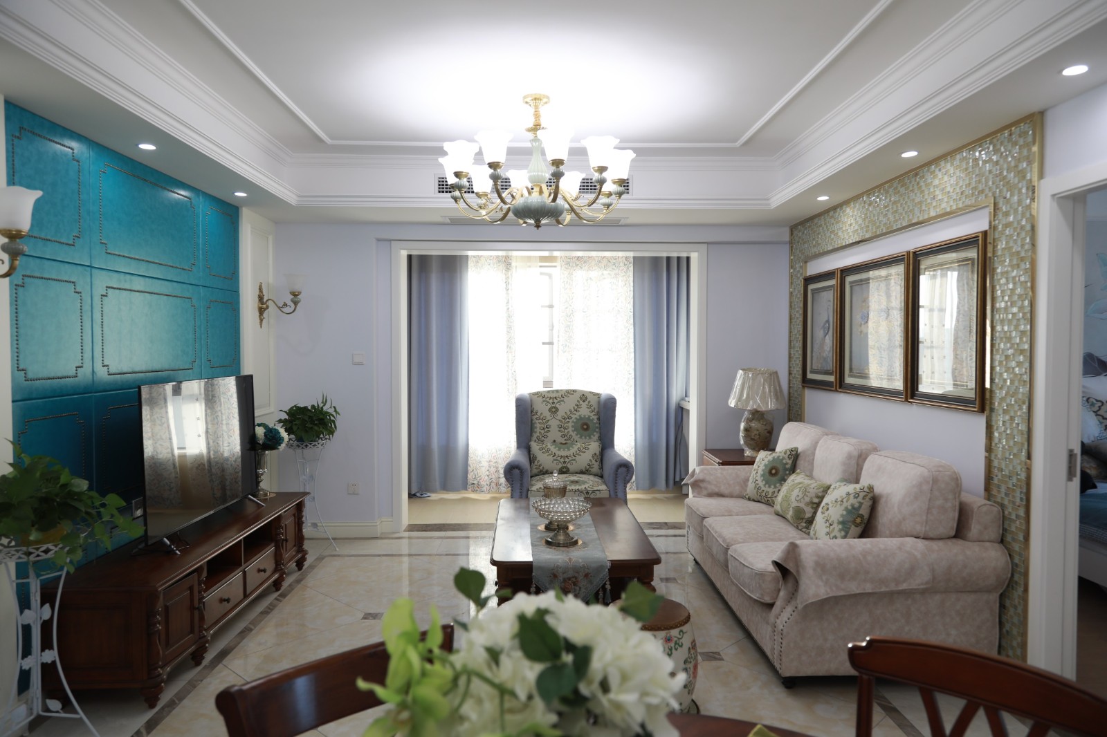 淡藍色的墻面搭配上淺色暗紋的沙發,低調中又帶有一抹淡淡的清新氣息。木質桌子則與不易沙發之間形成碰撞,提升了空間的立體感與質感。