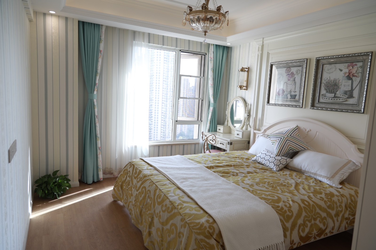 素色條紋壁紙搭配上淺藍色田園風窗簾,清新典雅而又不失自然浪漫風情。
