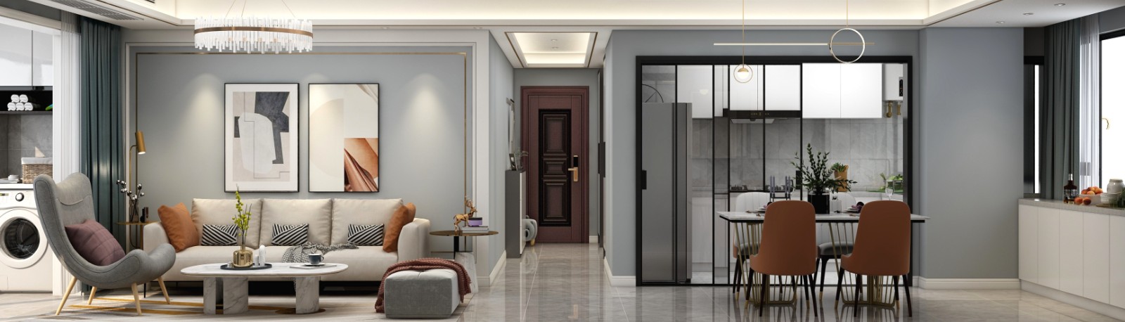 美聯(lián)城仕這套114㎡的三居室住宅雖然整體戶(hù)型較為平整,但是由于入戶(hù)長(zhǎng)度過(guò)長(zhǎng),占用了較多空間且實(shí)用性不強(qiáng),因此設(shè)計(jì)師在進(jìn)行規(guī)劃設(shè)計(jì)的時(shí)候?qū)θ霊?hù)走廊及玄關(guān)進(jìn)行了改造,增強(qiáng)該區(qū)域的實(shí)用性與觀(guān)賞度。為滿(mǎn)足業(yè)主的辦公需求,設(shè)計(jì)師將次臥空間打造成一個(gè)多功能書(shū)房,即可辦公閱讀,也可滿(mǎn)足居住需求。