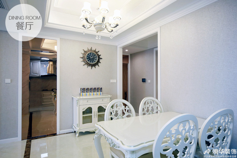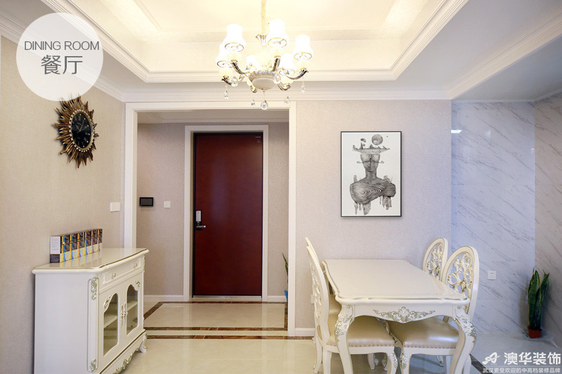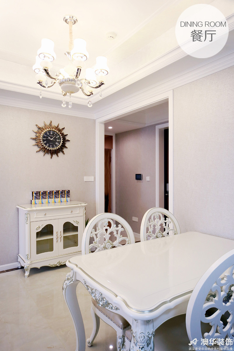 當空間嚴重不足、又不想放棄酒柜時,如何處理?設計師在公用墻給出了合理建議:低矮半透明的餐邊柜,柜內存放酒杯、柜面陳列裝飾品,墻上那幅古銅色掛鐘是點睛之筆。