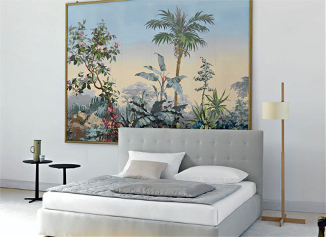 床頭主題墻處選擇壁紙時,盡量選擇故事性的壁紙,或者是自然元素的,會更有趣。